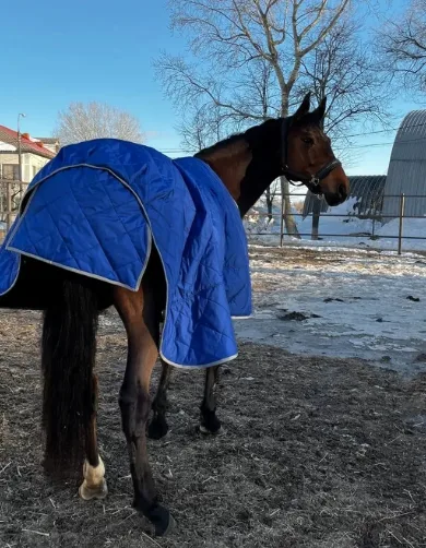 - Попона зимняя, цвет синий (арт. 418327): Теплая попона обеспечит защиту вашей лошади от холода и сохранит её сухой. Сшита из водонепроницаемой и дышащей ткани с подкладкой из хлопка, проклеенными швами и утеплителем. Водоотталкивающая и дышащая ткань обеспечивает комфорт животному.