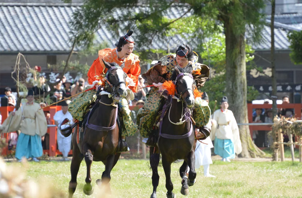 Традиции живы и за пределами Киото. Яркий пример — Святилище Камо в Оми-Хатимане (префектура Сига). Этот район с древних времен славился разведением императорских лошадей. Святилище, чья статуя священной лошади (синмэ) пострадала от тайфуна в 2018 году, проводит свои уникальные ритуалы: Сайтэн-кейба (май) и Ашифусе-но-сом (ноябрь). Это зрелищные скачки по прямой, где всадники не только мчатся, но и активно взаимодействуют — размахивают кнутами, кричат, сталкиваются бамбуковыми шестами. Победитель получает почетный баннер святилища.