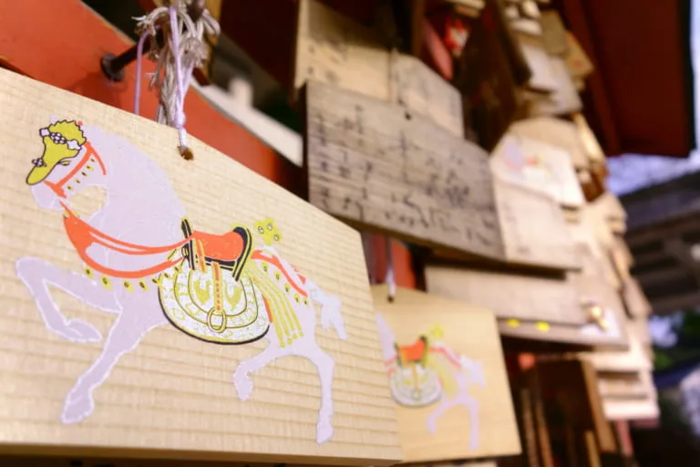 В ритуалах используются деревянные таблички для загадывания желаний – эма – которые исторически являются символической заменой подношения живой лошади божествам.