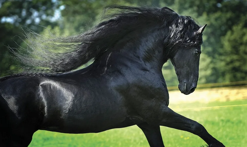 Экстерьер: Мощное, но элегантное телосложение, густые грива и хвост (фризы), изогнутая толстая шея.