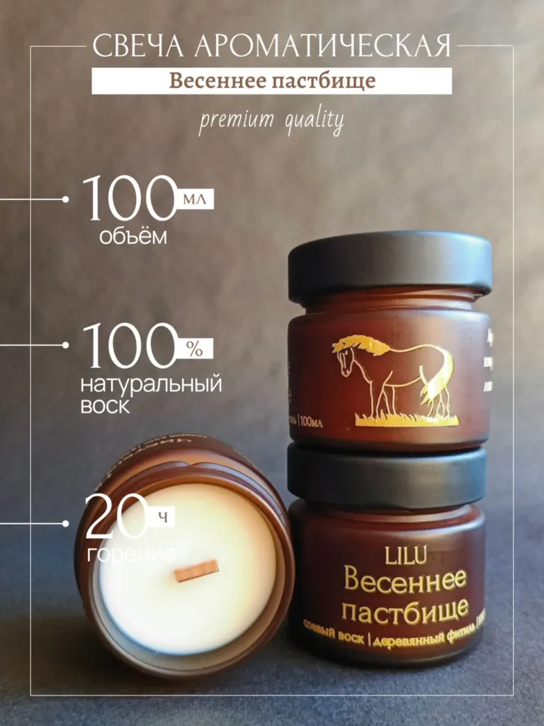 Свеча «Весеннее пастбище» от Lilu — для тех, кто сходит с ума по запаху молодой травы, от которого лошади готовы свернуть горы. Натуральный соевый воск, деревянный фитиль и аромат, который перенесет вас на пастбище в один миг.